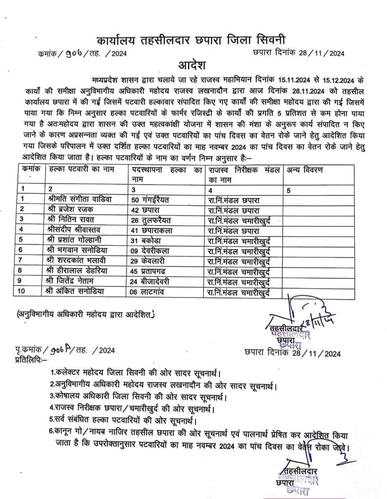 Leave a Comment / Uncategorized / By admin सिवनी : राजस्व महाभियान 3.0 मे प्रगति न आने पर 10 पटवारियों के 5 दिन का वेतन काटने के आदेश
