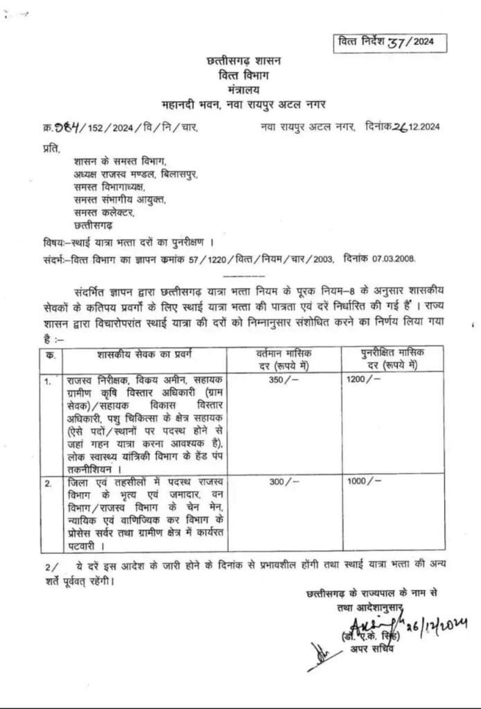 Leave a Comment / Uncategorized / By admin छत्तीसगढ़ : पटवारी सहित अन्य कर्मचारियों का यात्रा भत्ता बढ़ाया गयाChhattisgarh: Travel allowance of Patwari and other employees increased