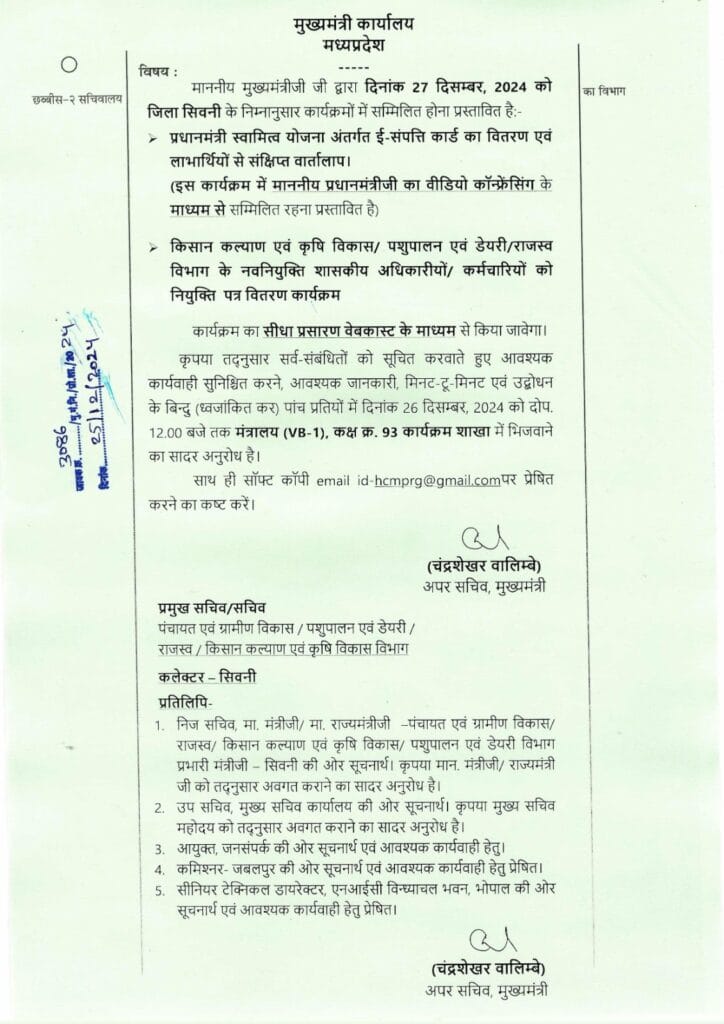 CM_in_Seoni271224 Leave a Comment / Uncategorized / By admin सिवनी : जिला सिवनी मे 27 दिसंबर को मुख्यमंत्री जी का प्रस्तावित कार्यक्रम