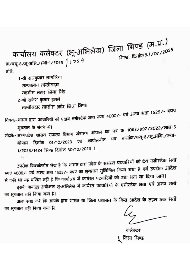 Leave a Comment / Uncategorized / By admin भिंड : कार्यालय में कार्यरत पटवारियों को एग्री स्टैक भत्ता देने का आदेशBhind: Order to provide Agri Stack Allowance to the patwaris working in the office.