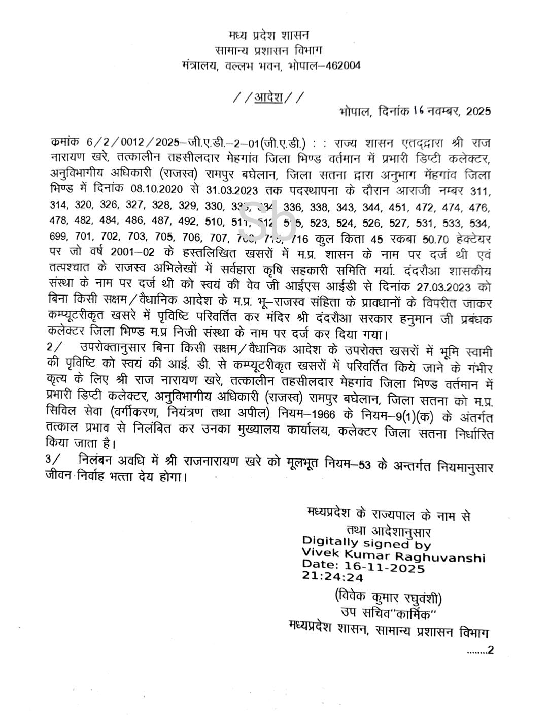 आदेश में कहा गया है कि राज नारायण खरे, जो पूर्व में तहसीलदार मेहगाँव, जिला भिण्ड तथा वर्तमान में प्रभारी डिप्टी कलेक्टर, अनु. जनजाति विकास (राजस्व) रायपुर बघेलान, जिला सतना पदस्थ हैं, उन्होंने अपनी सेवाकाल के दौरान गंभीर अनियमितताएँ कीं।