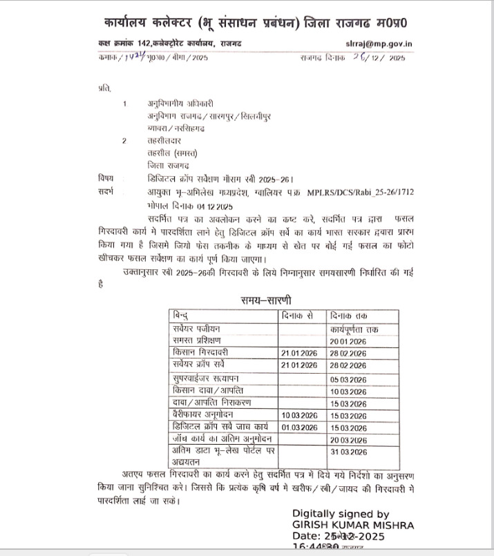 यह पत्र कार्यालय कलेक्टर (भू-संसाधन प्रबंधन) जिला राजगढ़ द्वारा जारी किया गया है। इसमें डिजिटल क्रॉप सर्वेक्षण रबी 2025–26 के संबंध में निर्देश दिए गए हैं। पत्र अनुविभागीय अधिकारी (रा0) एवं तहसीलदारों को संबोधित है।