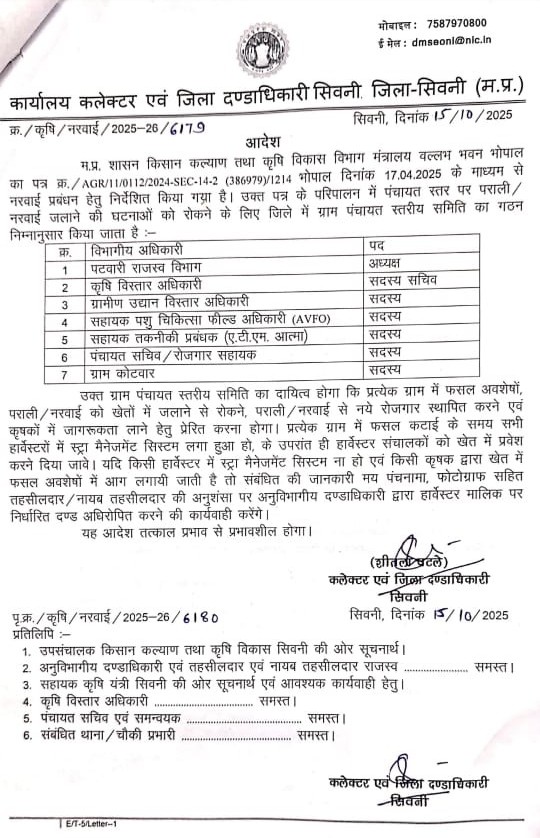 इस आदेश में कलेक्टर एवं जिला दण्डाधिकारी, सिवनी (म.प्र.) द्वारा ग्राम पंचायत स्तर पर नरवाई प्रबंधन समिति के गठन के निर्देश दिए गए हैं।