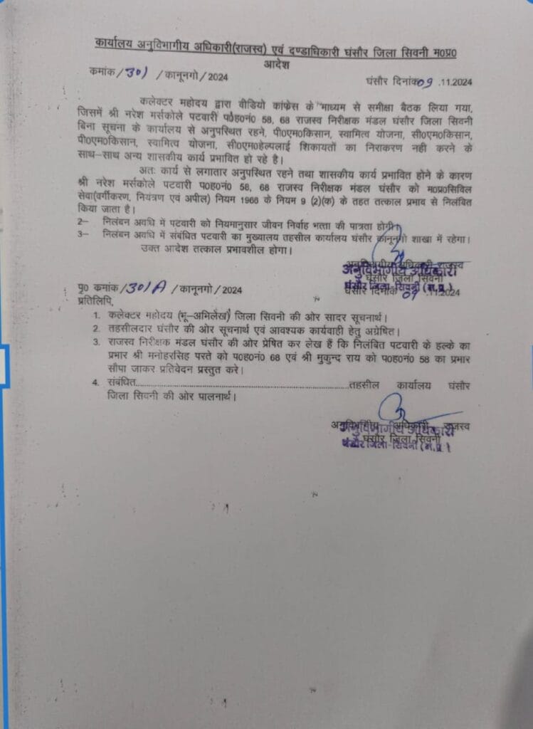 Seoni_patwari_suspended_091124 Leave a Comment / Uncategorized / By admin सिवनी : पटवारी को कार्य में लापरवाही के चलते निलंबित कियाSeoni: The patwari was suspended due to negligence in work.