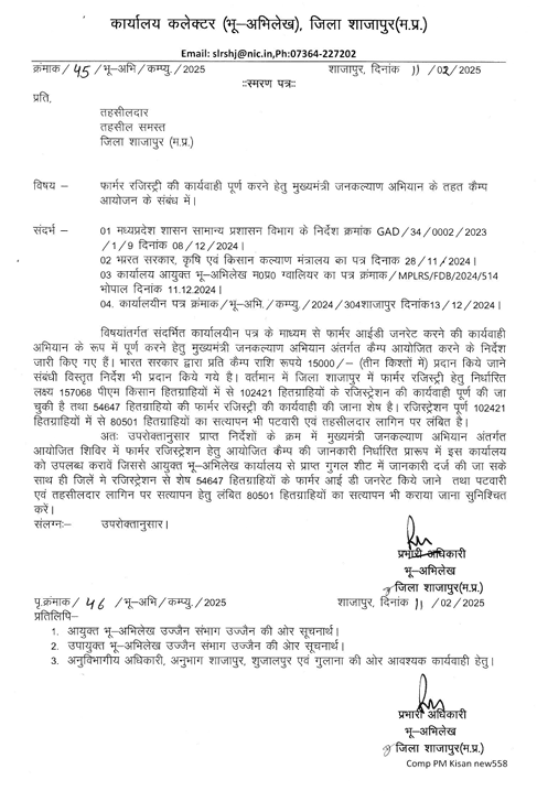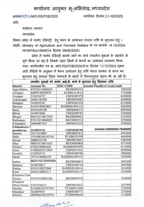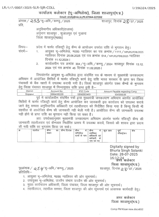 Shajapur_FR_Camp_280725 Leave a Comment / Uncategorized / By admin शाजापुर : फार्मर रजिस्ट्री के केम्प हेतु राशि का भुगतानShajapur: Payment for the farmer registry camp.***********