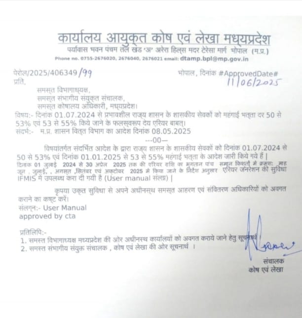 विषय:- दिनांक 01.07.2024 से प्रभावशील राज्य शासन के शासकीय सेवकों को महंगाई भत्ता दर 50 से 53% एवं 53 से 55% किये जाने के फलस्वरूप देय एरियर बाबत्।