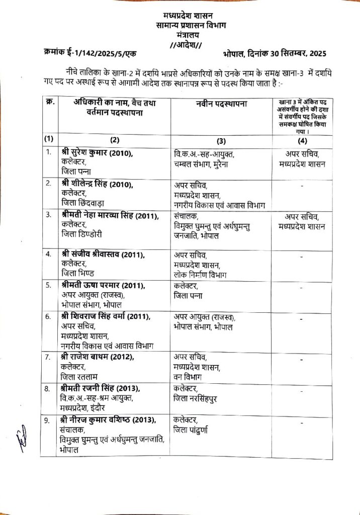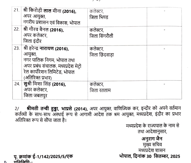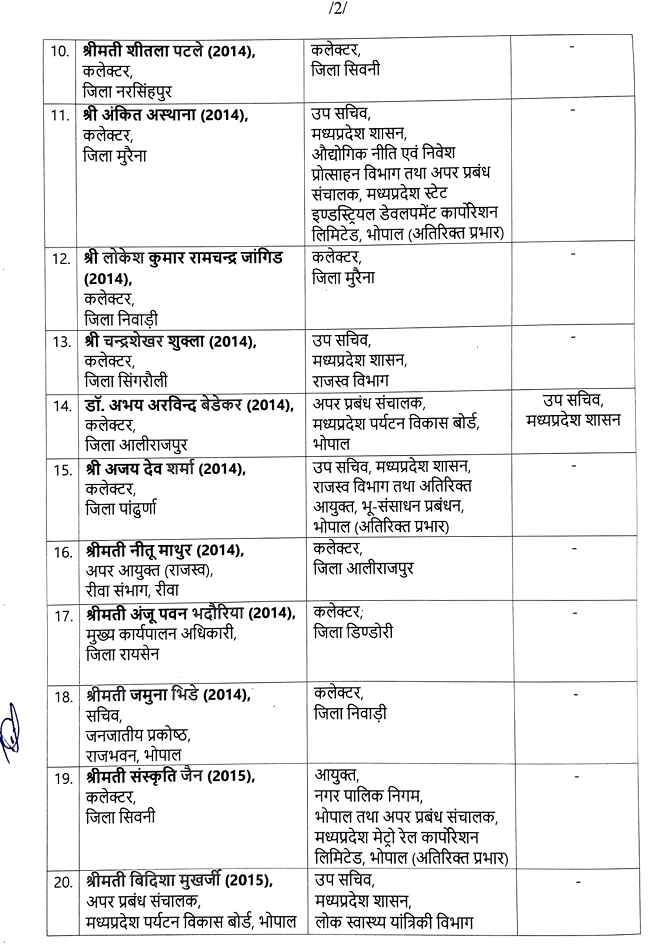 भोपाल नगर निगम कमिश्नर हरेंद्र नारायण को छिंदवाड़ा का कलेक्टर बनाया गया है। उन पर भाजपा नेताओं ने फोन न उठाने के आरोप सार्वजनिक तौर पर लगाए थे। वहीं, पन्ना कलेक्टर रहे सुरेश कुमार को मुरैना का संभागायुक्त नियुक्त किया गया है।