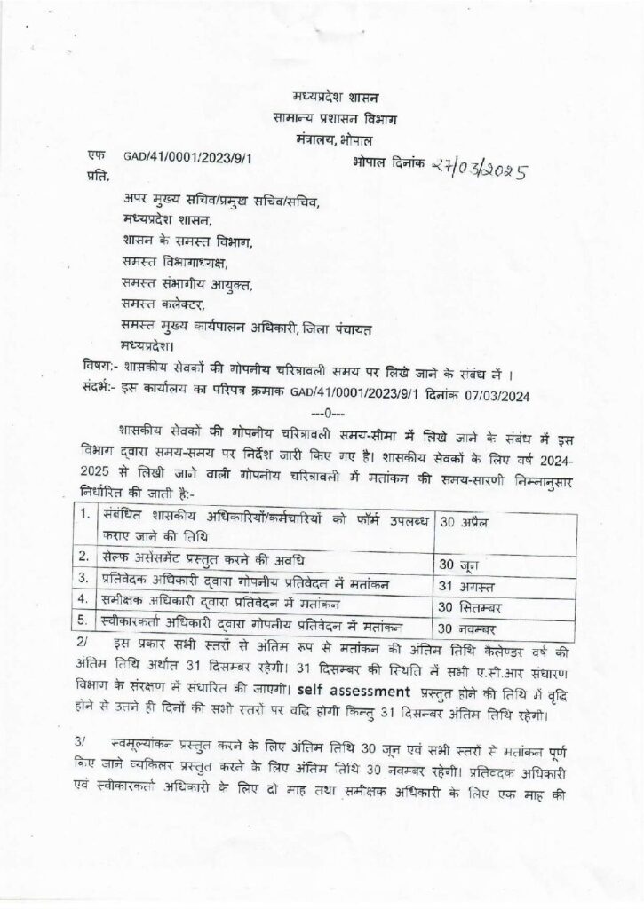 यह एक परिपत्र है जो शासकीय सेवकों की गोपनीय चरित्रावली (ACR) समय पर लिखे जाने के संबंध में मध्य प्रदेश शासन, सामान्य प्रशासन विभाग द्वारा जारी किया गया है ।