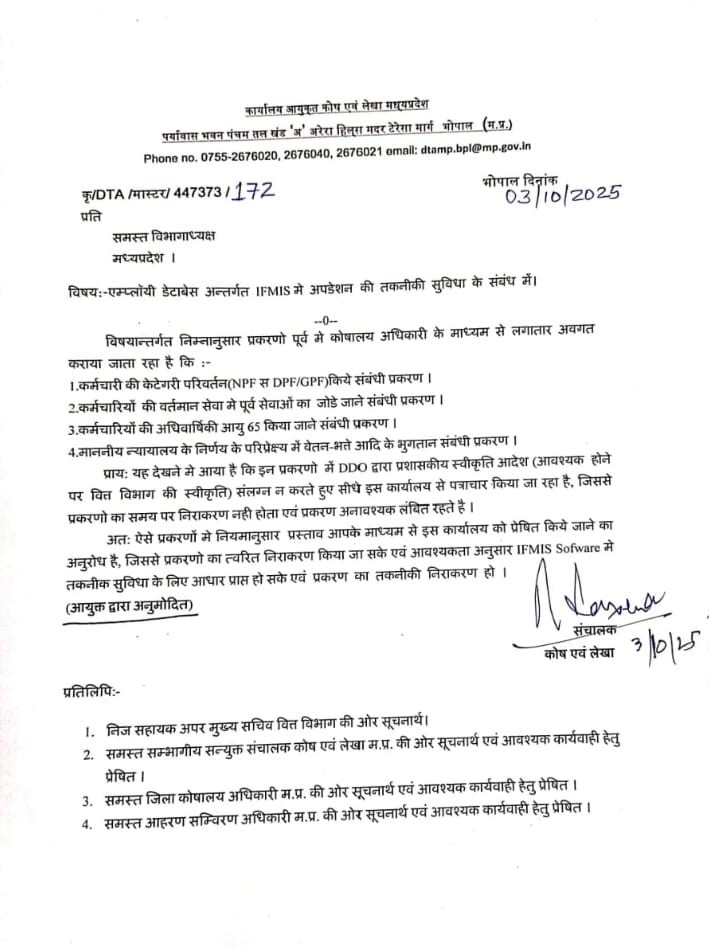 मध्य प्रदेश शासन वित्त विभाग और उसके अधीनस्थ आने वाले विभाग- कार्यालय आयुक्त कोष एवं लेखा भोपाल से समस्त विभागों के विभाग के विभागअध्यक्षों को IFMIS पोर्टल पर अपने-अपने विभाग के कर्मचारी की जो गलत डाटा एंट्री की गई है जैसे- प्रथम नियुक्ति दिनांक, नाम आदि में गलतियां हुई हैं उनको पूर्व की सेवा के साथ जोड़कर सही प्रथम नियुक्ति दिनांक अंकित किए जाने की आदेश व अवसर दिए जा रहे हैं