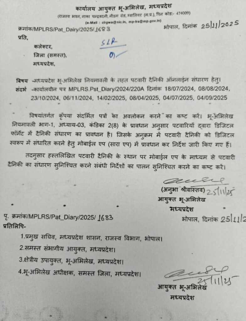 प्रदेश में पटवारी दैनिक संधारण अब पूरी तरह डिजिटल/मोबाइल एप से ही करना अनिवार्य किया गया है। सभी कलेक्टरों को इसे सुनिश्चित करने के निर्देश दिए गए हैं।