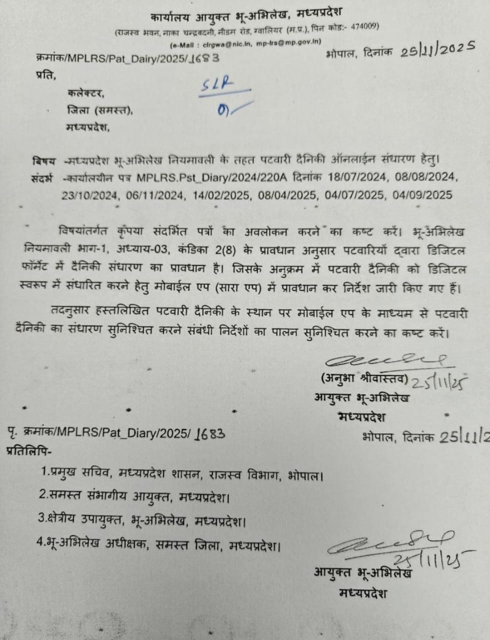 पत्र आयुक्त भू-अभिलेख, मध्यप्रदेश द्वारा सभी जिलों के कलेक्टरों को भेजा गया है। इसमें कहा गया है कि पूर्व में भेजे गए पत्रों के संदर्भ में पटवारी दैनिक ऑनलाइन संधारण को अनिवार्य रूप से लागू किया जाए।