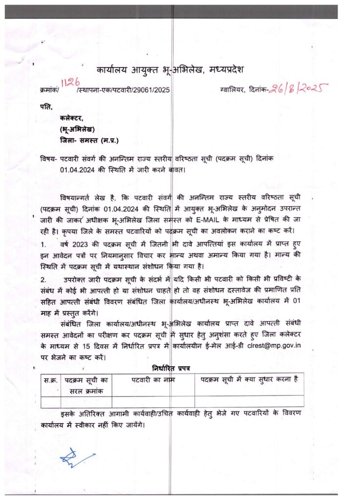 Patwari_Seniority_List_2024_260825 Leave a Comment / Uncategorized / By admin पटवारी राज्यस्तरीय वरिष्ठता सूचि 2024 जारी किये जाने बावतRegarding release of Patwari State Level Seniority List 2024