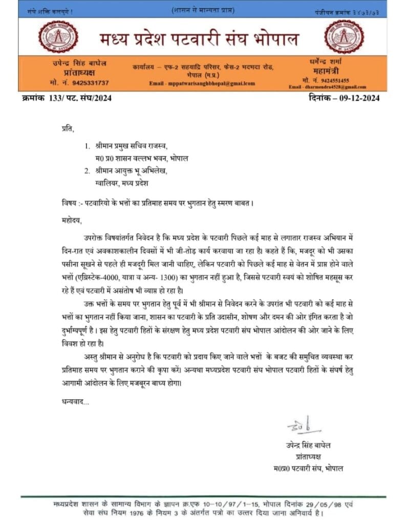 पटवारी के भत्तों का समय पर भुगतान करने हेतु स्मरण पत्र