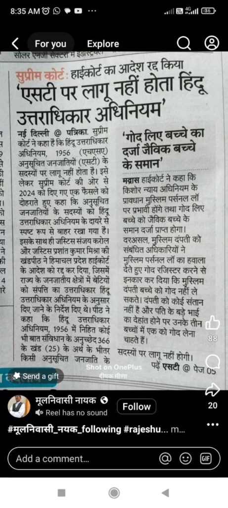 सुप्रीम कोर्ट : एस.टी. पर लागू नहीं होता हिन्दू उत्तराधिकार अधिनियम