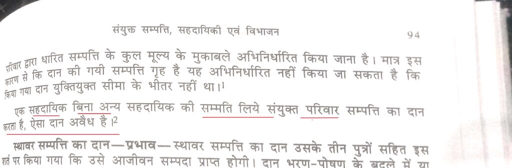 सहमति की अनिवार्यता: यदि कोई एक सहदायक (Coparcener) अन्य सहदायकों की सहमति के बिना संयुक्त परिवार की संपत्ति का दान करता है, तो ऐसा दान अवैध (void/invalid) माना जाता है।