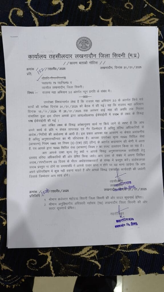 Leave a Comment / Uncategorized / By admin सिवनी : राजस्व महाभियान में न्यूनतम प्रगति के कारण 21 पटवारियों को मिला कारण बताओ नोटिस