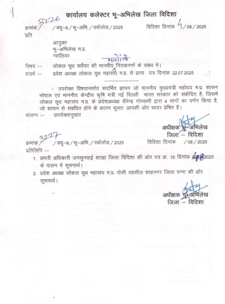 Ly_Vidisha_040825 Leave a Comment / Uncategorized / By admin विदिशा : लोकल युथ की मांगो के निराकरण के सम्बन्ध में अधीक्षक भू अभिलेख का पत्र