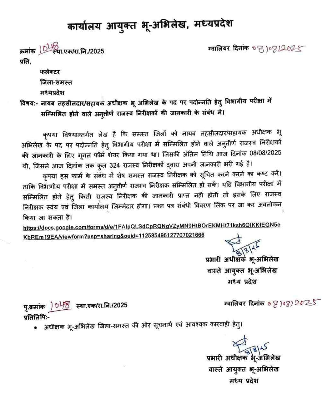 नायब तहसीलदार के पद पर पदोन्नति हेतु विभागीय परीक्षा में सम्मिलित होने वाले अनुत्तीर्ण राजस्व निरीक्षकों की जानकारी