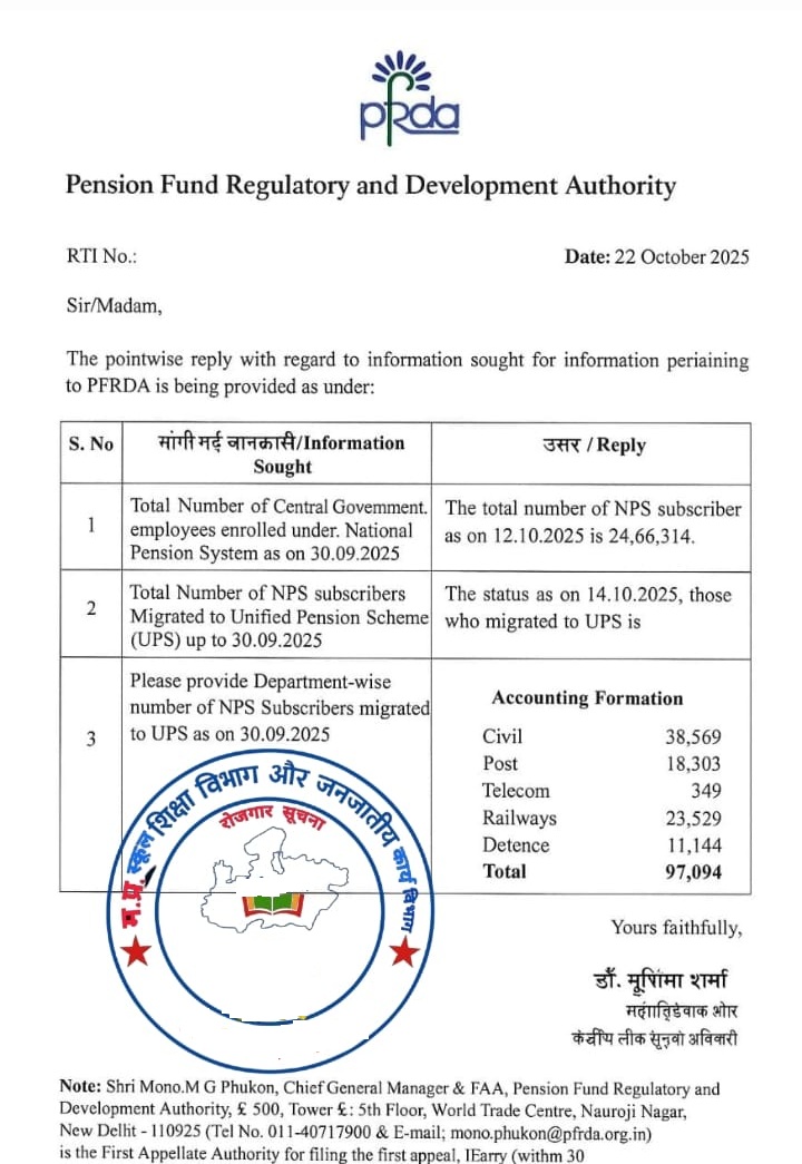 Date Topic Download 22/10/2025 97 हजार केंद्रीय कर्मचारियों ने NPS छोड़कर UPS पेंशन का विकल्प चुना 97 thousand central employees opted for the UPS pension instead of NPS Download 16/10/2025 छत्तीसगढ़ : दीपावली के उपलक्ष्य में माह अक्टूबर का अग्रिम वेतन भुगतान करने का आदेश Chhattisgarh: Order for advance salary payment for the month of October on the occasion of Diwali Download 04/10/2025 अपनी मांगो को लेकर रोजगार सहायक 06 अक्टूबर से सामूहिक अवकाश पर Employment assistants will go on a collective leave from October 6 regarding their demands Download 03/10/2025 राजस्थान : राजस्थान में मंहगाई भत्ता 3% बढाकर 55 प्रतिशत से 58 प्रतिशत किया गया Rajasthan: In Rajasthan, the Dearness Allowance has been increased by 3% from 55 percent to 58 percent. Download 02/10/2025 सेवाकाल में मृत्यु होने पर मृतक संविदा कर्मचारियों के परिवार को EDLI के प्रावधान अनुसार बीमा योजना का लाभ प्रदाय सुनिश्चित किये जाने विषयक Regarding ensuring the provision of insurance scheme benefits under EDLI to the family of contractual employees in the event of death during service. Download 02/10/2025 छह प्रमुख रबी फसलों के न्यूनतम समर्थन मूल्य (MSP) में बढ़ोतरी Minimum Support Price (MSP) hiked for six major Rabi crops .Download 29/09/2025 सिवनी : 60 वर्ष से अधिक उम्र के वृद्धजनों को आवश्यक उपकरण प्रदाय करने के सम्बन्घ में Seoni : Regarding the provision of necessary equipment to elderly people over the age of 60 Download 29/09/2025 माध्यमिक शिक्षक एवं प्राथमिक शिक्षक रिजल्ट के सम्बन्ध में फर्जी सूचना Fake information regarding the results of secondary and primary teachers Download 29/09/2025 अतिथि शिक्षक की व्यवस्था के सम्बन्ध में Regarding the arrangement of guest teachers Download 29/09/2025 ग्राम रोजगार सहायक संघ ने पुराने आदेश के तहत निर्वाचन कार्य से मुक्त रखने हेतु ज्ञापन दिया The Village Employment Assistant Association submitted a memorandum to be exempted from election work under the old order. Download 28/09/2025 वर्ष 2025-26 में विद्यालयों में घोषित अवकाश Declared holidays in schools in the year 2025-26 Download 27/09/2025 ग्राम रोजगार सहायको को बढे हुए मानदेय के भुगतान हेतु बजट आवंटित Budget allocation for payment of increased remuneration to GRS Download 26/09/2025 राज्य कर्मचारी संघ ने 70 प्रतिशत, 80 प्रतिशत एवं 90 प्रतिशत स्टायफंड को समाप्त कर पूर्व की भांति नियुक्ति दिनांक से पूर्ण वेतन देने एवं परिवीक्षा अवधि 2 वर्ष किये जाने हेतु ज्ञापन दिया The State Employees Association submitted a memorandum to abolish 70%, 80%, and 90% of the stipend, to provide full salary from the date of appointment as before, and to set the probation period to 2 years. Download 25/09/2025 माध्यमिक शिक्षक एवं प्राथमिक शिक्षक चयन परीक्षा -2024 का परीक्षा परिणाम घोषित The examination results of the Secondary and Primary Teacher Selection Examination – 2024 have been announced. Download 24/09/2025 जनजातीय कार्य विभाग ने ई – अटेंडेंस लागू की The Tribal Affairs Department has implemented e-attendance. Download 23/09/2025 सागर : 1 अक्टूबर को अवकाश घोषित Sagar: Holiday declared on October 1st Download 20/09/2025 सिंगरौली : अतिथि शिक्षकों का मानदेय भुगतान किये जाने बावद आदेश Singrauli: Order for the payment of honorarium to guest teachers. Download 20/09/2025 एकलव्य आदर्श आवासीय विद्यालयों में भर्ती Job in Eklavya Model Residential Schools Download 19/09/2025 पंचायत सचिव की भर्ती में ग्राम रोजगार सहायकों 50 प्रतिशत आरक्षण देने हेतु समिति गठित A committee has been formed to provide 50 percent reservation for village employment assistants in the recruitment of the Panchayat Secretary. Download 11/09/2025 भिंड : शिक्षक की 3 संताने होने पर कार्यवाही के आदेश Bhind: Order for action upon the teacher having 3 children. Download 10/09/2025 अनुसूचित जाति एवं अनु