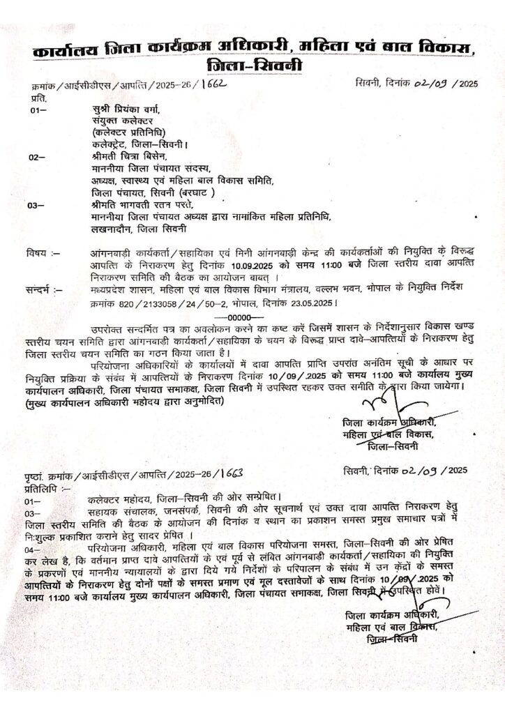सिवनी : आंगवाड़ी कार्यकर्ता/सहायिका की नियुक्ति में दावा आपत्ति का निराकरण