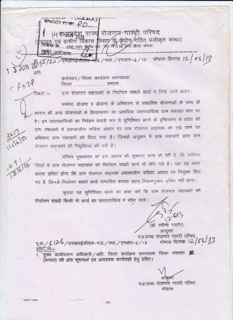 - शासन के पत्र (दिनांक 12/06/2013) में स्पष्ट किया गया है कि ग्राम रोजगार सहायकों को निर्वाचन कार्य से मुक्त रखा गया है।