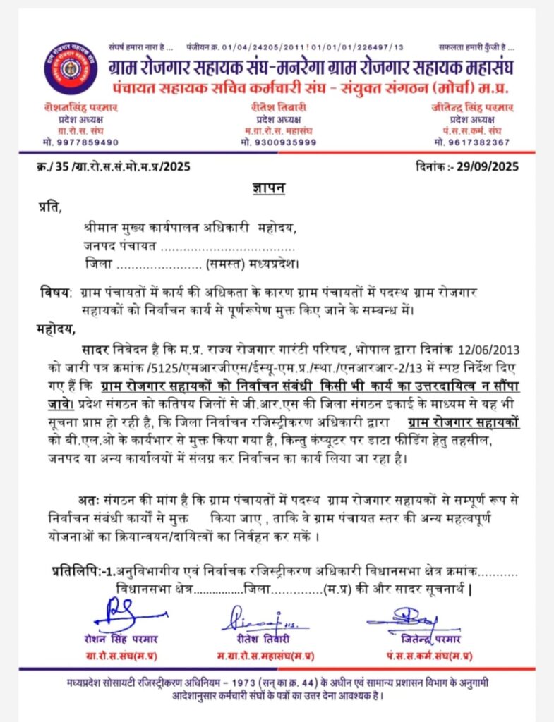 - संघ की मांग है कि ग्राम पंचायतों में पदस्थ ग्राम रोजगार सहायकों को पूरी तरह से निर्वाचन संबंधी कार्यों से मुक्त किया जाए, ताकि वे अपने वास्तविक कार्य जैसे योजनाओं का क्रियान्वयन और तालिकाओं का संचालन सही ढंग से कर सकें।