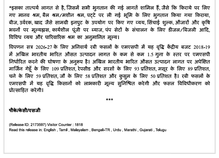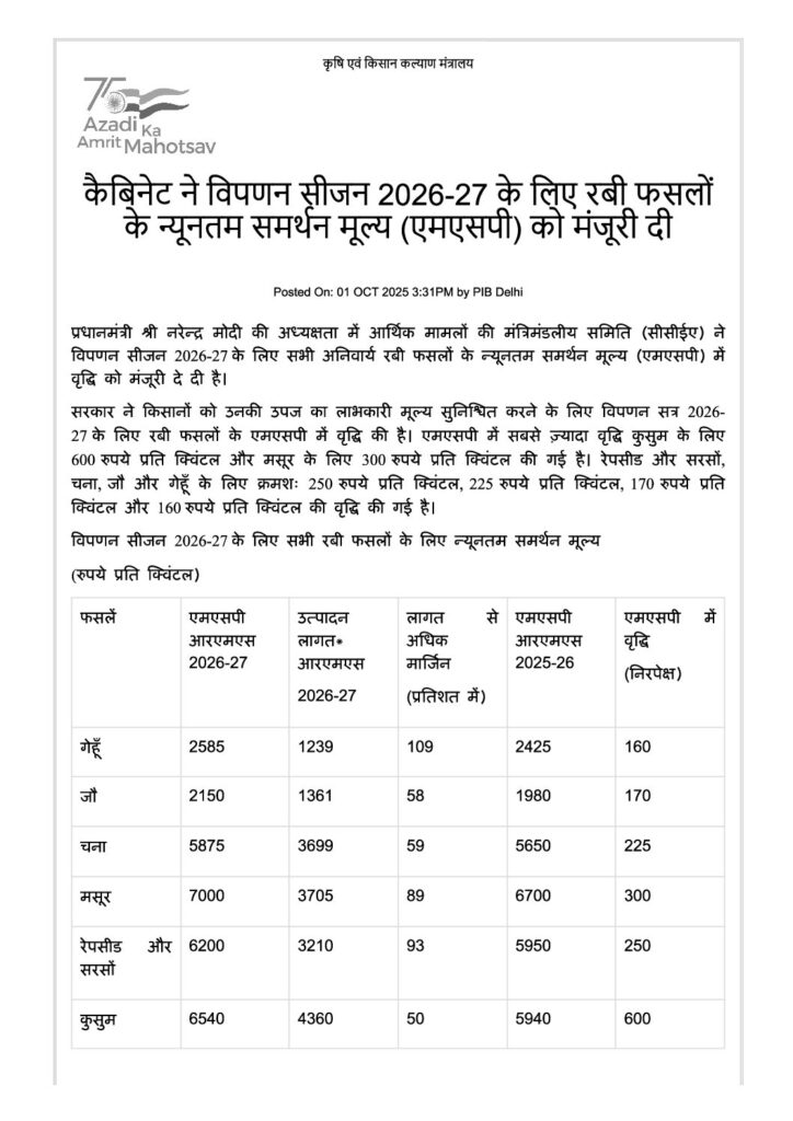 MSP_hiked_2026-27 Leave a Comment / Uncategorized / By admin छह प्रमुख रबी फसलों के न्यूनतम समर्थन मूल्य (MSP) में बढ़ोतरीMinimum Support Price (MSP) hiked for six major Rabi crops