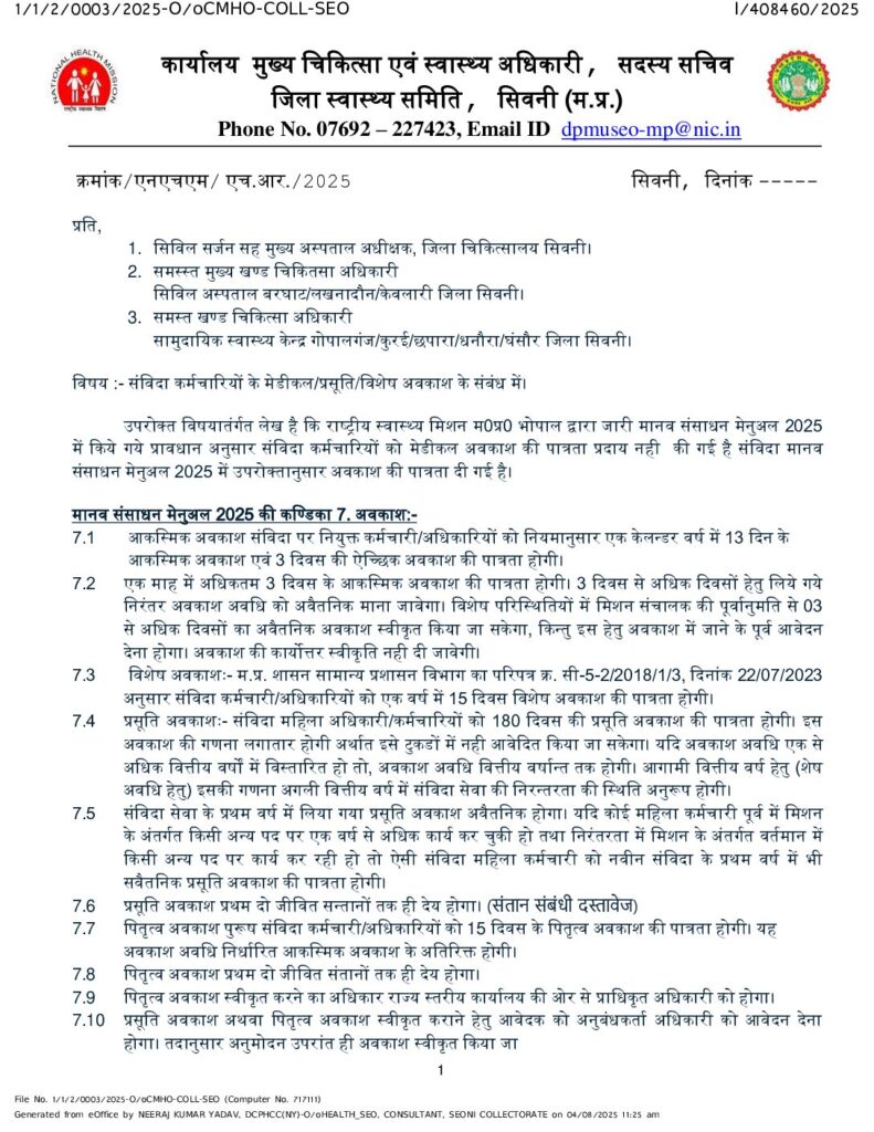 Leave a Comment / Uncategorized / By admin सिवनी : स्वास्थ्य संविदा कर्मचारियों को अवकाश के सम्बन्ध मेंSeoni: Regarding the leave of health contract employees