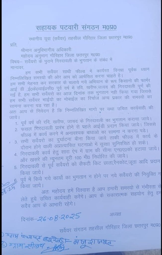 Leave a Comment / Uncategorized / By admin छतरपुर : सर्वेयरो का पुरानी गिरदावरी के भुगतान के सम्बन्ध में ज्ञापनChhatarpur: Memorandum regarding the payment of old surveyors’ land record.