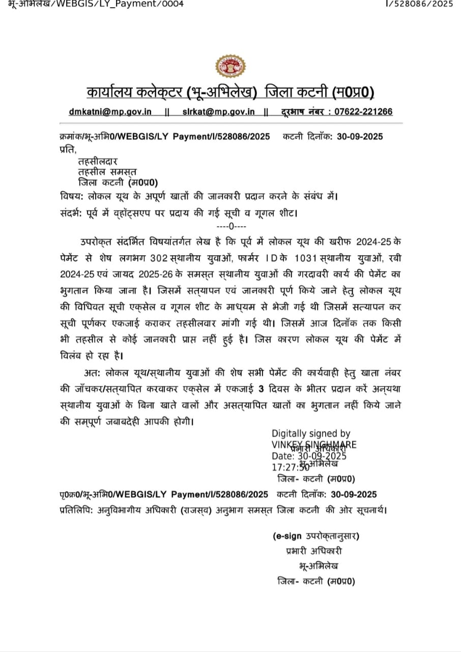 कटनी : लोकल युथ के अपूर्ण खातों की जानकारी प्रदान करने हेतु आदेश