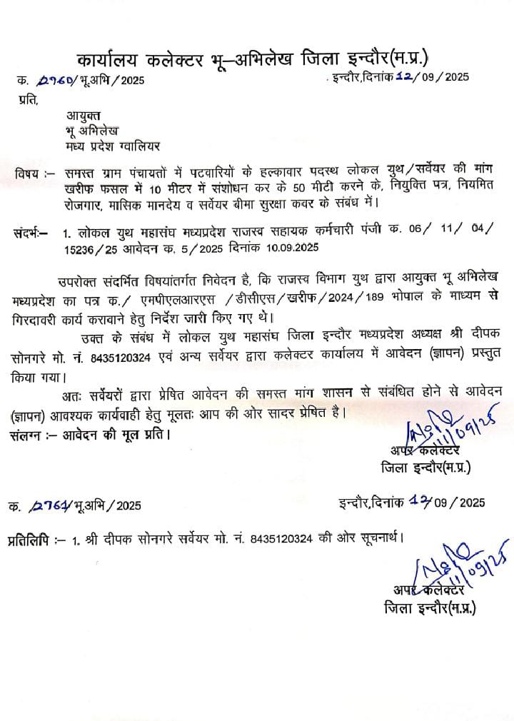 गिरदावरी का दायरा 10 मीटर से 50 मीटर करने एवं अन्य मांगो के सम्बन्ध में इंदौर कलेक्टर का पत्र