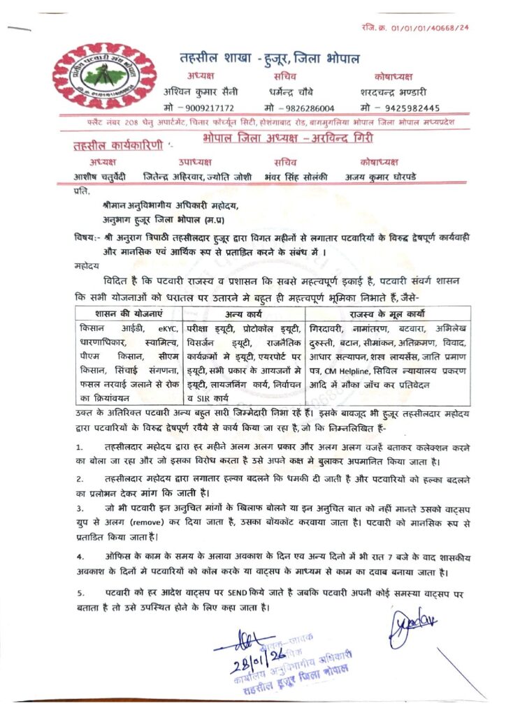 यह ज्ञापन प्रांतीय पटवारी संघ (तहसील शाखा-हुजूर, भोपाल) द्वारा 28 जनवरी 2026 को अनुविभागीय अधिकारी (SDM) को सौंपा गया है । इसमें तहसीलदार हुजूर, श्री अनुराग त्रिपाठी पर पटवारियों को मानसिक और आर्थिक रूप से प्रताड़ित करने के आरोप लगाए गए हैं ।
