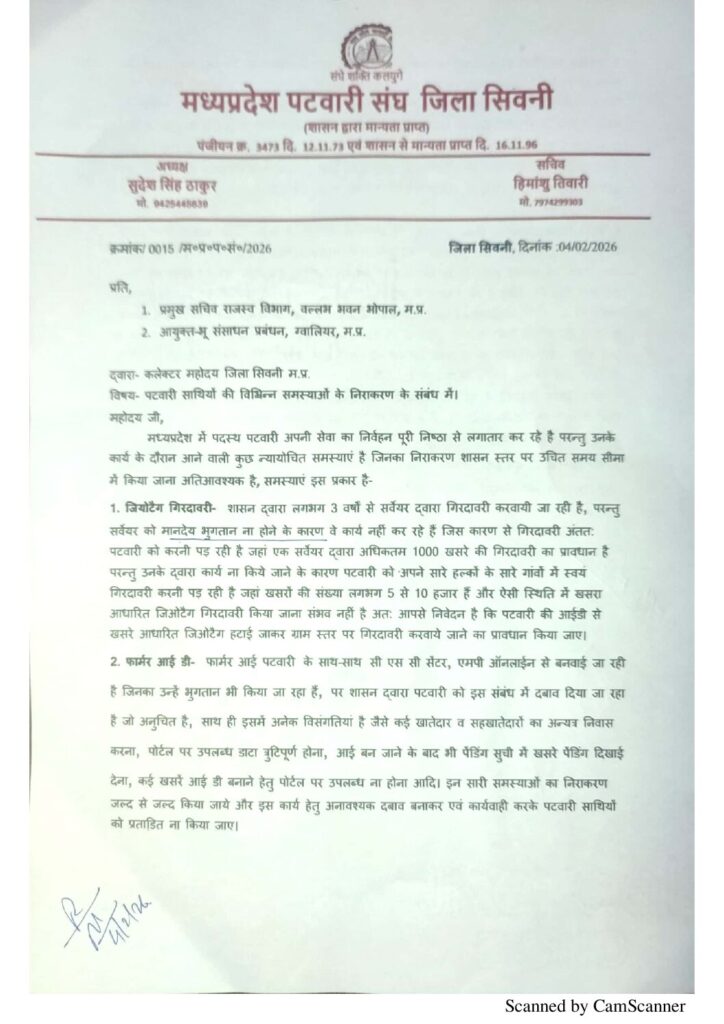 यह सारांश मध्यप्रदेश पटवारी संघ जिला सिवनी द्वारा 4 फरवरी 2026 को प्रस्तुत ज्ञापन पर आधारित है, जिसमें पटवारियों की विभिन्न समस्याओं के निराकरण की मांग की गई है:
