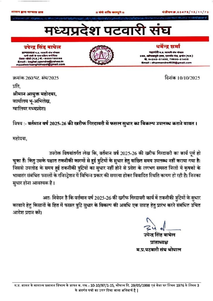 यह पत्र उपेन्द्र सिंह बाघेल, प्रांताध्यक्ष, म.प्र. पटवारी संघ भोपाल द्वारा दिनांक 10/10/2025 को जारी किया गया है, जिसका क्रमांक 260/पट. संघ/2025 है ।