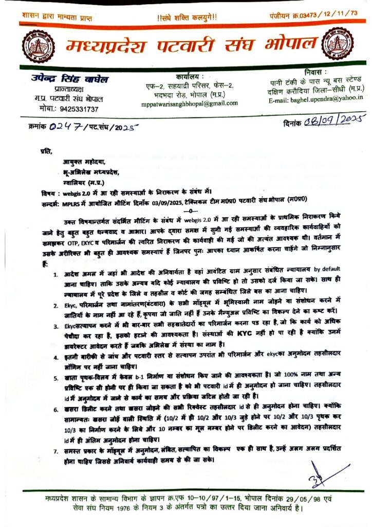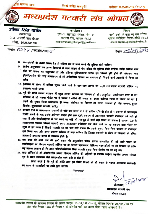 Patwari_Sangh_web-GIS_080925 Leave a Comment / Uncategorized / By admin पटवारी संघ : वेब जी आई एस 2.0 में आ रही समस्याओं के निराकरण के सम्बन्ध मेंPatwari Sangh : Regarding the resolution of issues arising in web-GIS 2.0