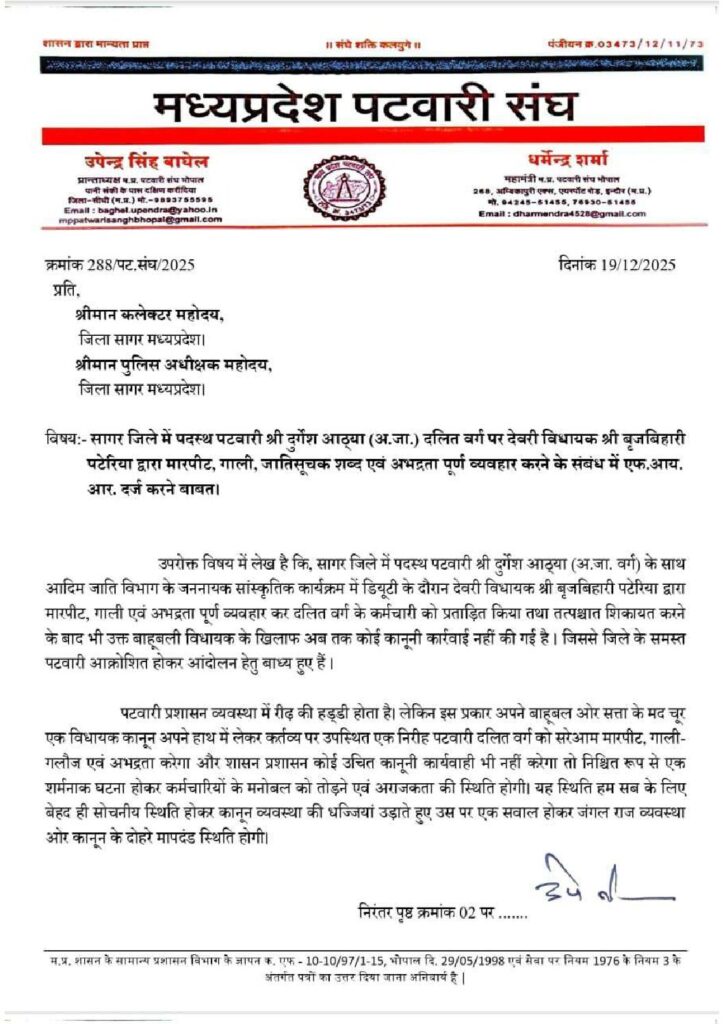 मध्यप्रदेश पटवारी संघ, भोपाल द्वारा दिनांक 19/12/2025 को जारी पत्र में सागर जिले की एक गंभीर घटना का उल्लेख किया गया है। पत्र के अनुसार, सागर जिले में पदस्थ पटवारी श्री दुर्गेश आयुध्या (अनु. जाति वर्ग) के साथ एक सांस्कृतिक कार्यक्रम के दौरान देवरी विधायक श्री बृजबिहारी पटेरिया द्वारा मारपीट, गाली-गलौज, जातिसूचक शब्दों का प्रयोग एवं अमर्यादित व्यवहार किया गया।