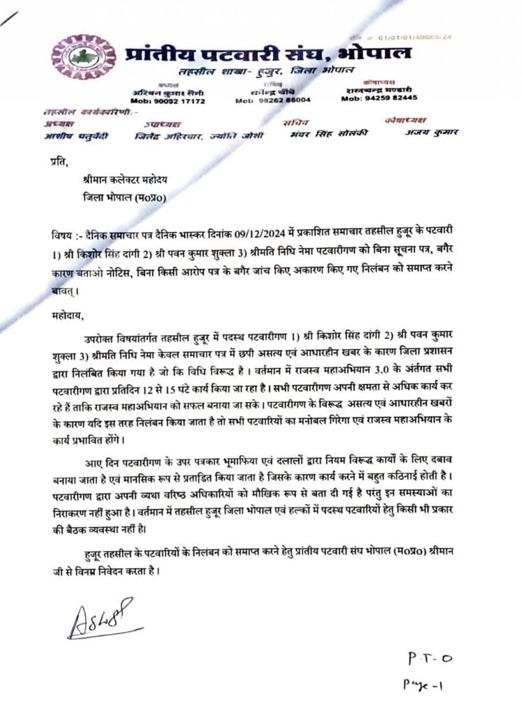 Patwari_Sangh_Bhopal_to_Collector Leave a Comment / Uncategorized / By admin भोपाल : पटवारी संघ का पटवारियों के निलंबन को समाप्त करने हेतु कलेक्टर को पत्र