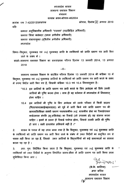 Leave a Comment / Uncategorized / By admin विमुक्त, घुमक्कड़ जातियों के व्यक्तियों को जाति प्रमाण पत्र जारी करने के आदेशOrder to issue caste certificate to the people of freed and nomadic castes