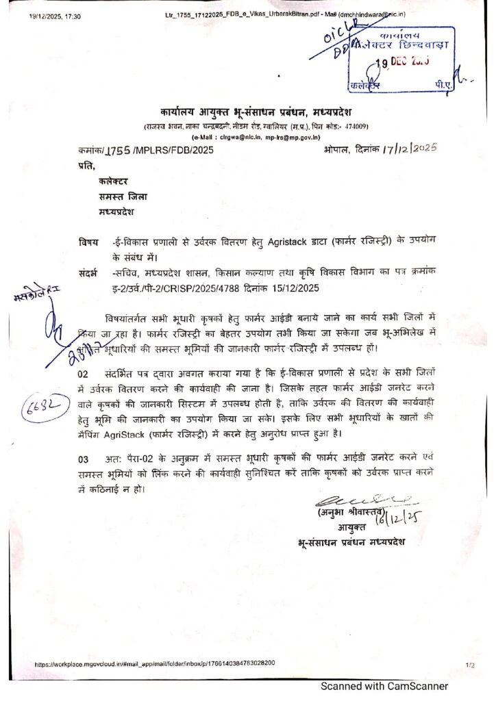- जारीकर्ता: अनुभा श्रीवास्तव, आयुक्त, भू-संसाधन प्रबंधन, मध्य प्रदेश