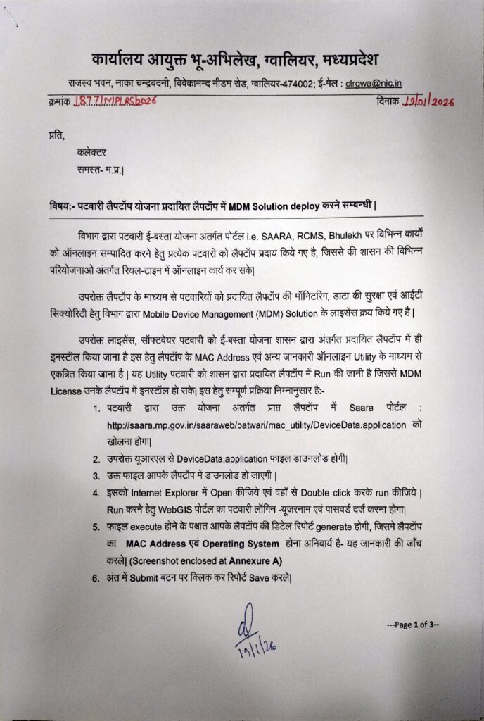 पटवारी लैपटॉप योजना के तहत वितरित लैपटॉप में MDM (Mobile Device Management) Solution को इंस्टॉल करने के संबंध में।