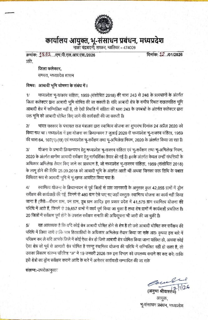 यह दस्तावेज़ आयुक्त, भू-संसाधन प्रबंधन, मध्यप्रदेश द्वारा जारी किया गया एक आधिकारिक पत्र है, जिसका मुख्य उद्देश्य राज्य में ‘स्वामित्व योजना’ के तहत छूटे हुए आबादी क्षेत्रों को सम्मिलित करना और उनकी घोषणा करना है।