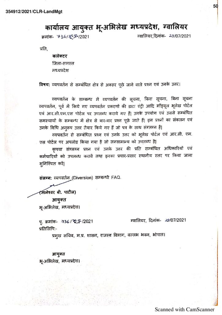 यह दस्तावेज़ मध्य प्रदेश के आयुक्त भू-अभिलख द्वारा 29 जुलाई 2021 को जारी किया गया है, जिसमें व्यपवर्तन (Diversion) से संबंधित अक्सर पूछे जाने वाले प्रश्नों (FAQs) के उत्तर दिए गए हैं ।