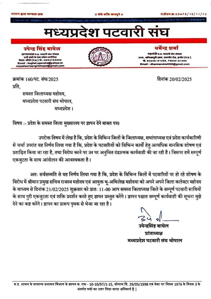 Leave a Comment / Uncategorized / By admin मध्य प्रदेश के समस्त जिलों में ज्ञापन दिए जाने पटवारी संघ का आवाहन