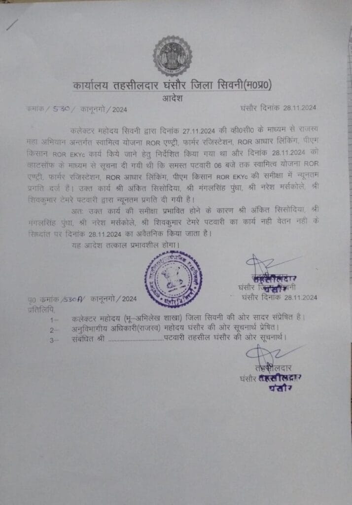 Leave a Comment / Uncategorized / By admin सिवनी : नो वर्क नो पे के आधार पर 4 पटवारियों का वेतन काटा गया